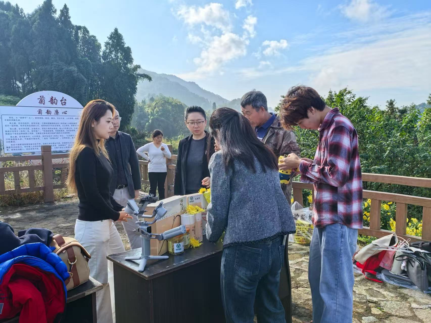 上午9时许,实践团队兵分两路展开行动。A组师生深入九花谷菊花园及配套加工厂,运用无人机航拍、延时摄影等技术手段,全方位记录300余亩金丝皇菊的种植盛况。在十里花果长廊的爱媛橙果园,团队成员创新采用“场景化直播”模式,搭建移动直播间、设计互动环节,将果实采摘、加工等过程实时呈现,生动展示黄金林村特色农产品的生长环境与品质优势。“我们通过专业特长,设计了‘果树认养’等互动内容,助力农产品推广,直播反响热烈。”24级网新专业学生李怡娴在直播结束后分享道。
