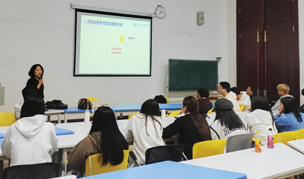 更新认知,树立专业自信。付莹璇老师紧跟时代脉搏,结合2024年最新行业数据,分析了保险市场的扩容潜力。她清晰梳理了“企业保障—家庭理财—社会治理”这一递进的需求链,帮助新生更新了对保险行业的传统认知。在活动尾声,她鼓励同学们要树立对“行业”和“自身”的“双自信”,主动学习,提升综合能力,为投身行业做好充分准备。