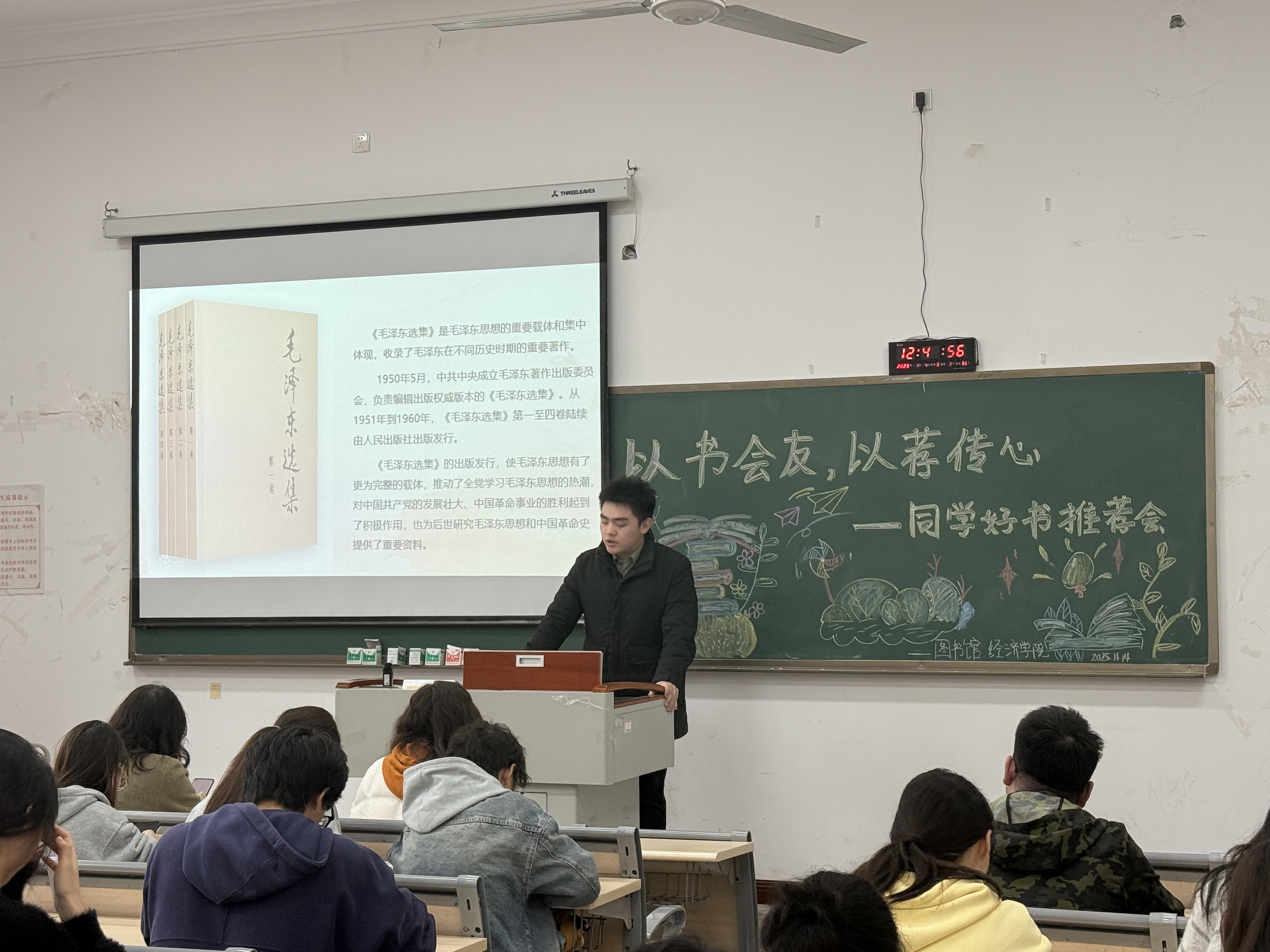 好书推荐会再燃红色力量!继首场专业书籍分享后,24级经统一班葛正源带来经典红色著作《毛泽东选集》,该书作为中国革命与建设时期的思想结晶,收录了不同历史阶段的重要著作,集中体现实事求是、群众路线等思想精髓,从“农村包围城市”的革命战略到新民主主义经济纲领,清晰勾勒思想演进轨迹,葛正源结合“陕甘宁边区大生产运动”等史实,解读书中“从实际出发”的思维方法与价值导向,为经济学专业同学理解中国特色经济发展历史根基、把握政策底层逻辑提供重要思想借鉴,也让推荐会在多元读物分享中持续拓宽知识边界。