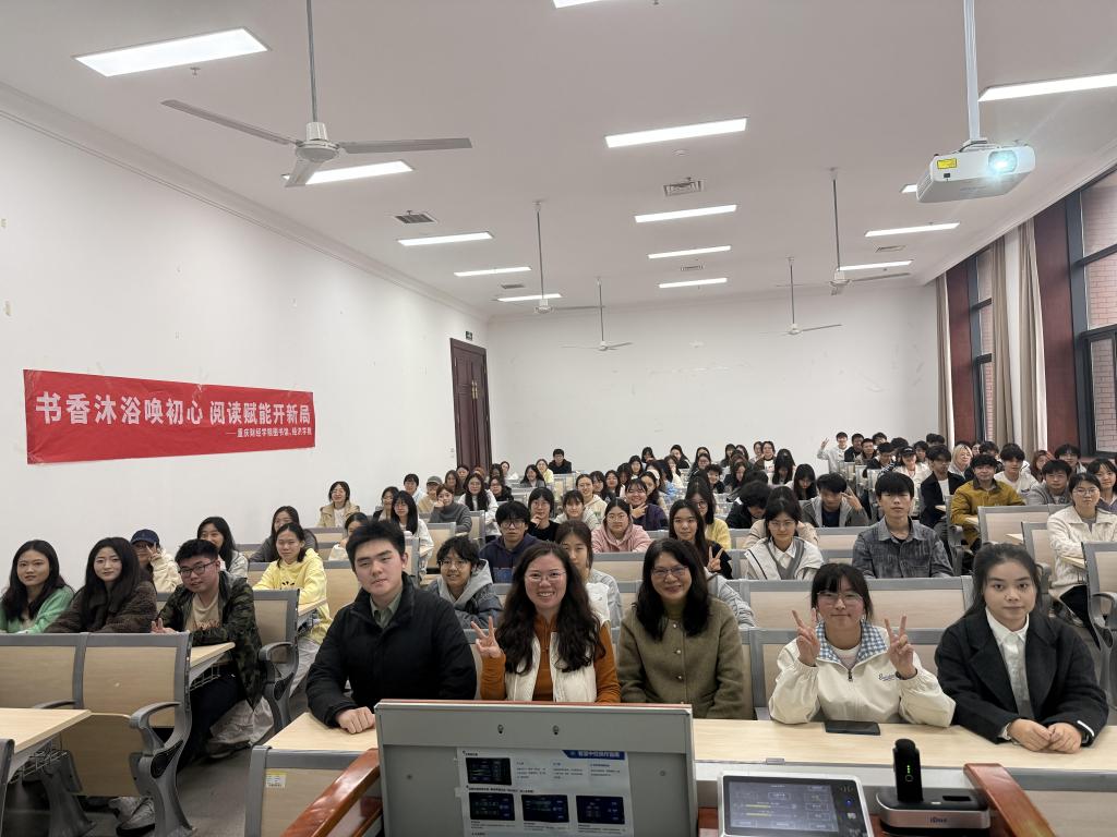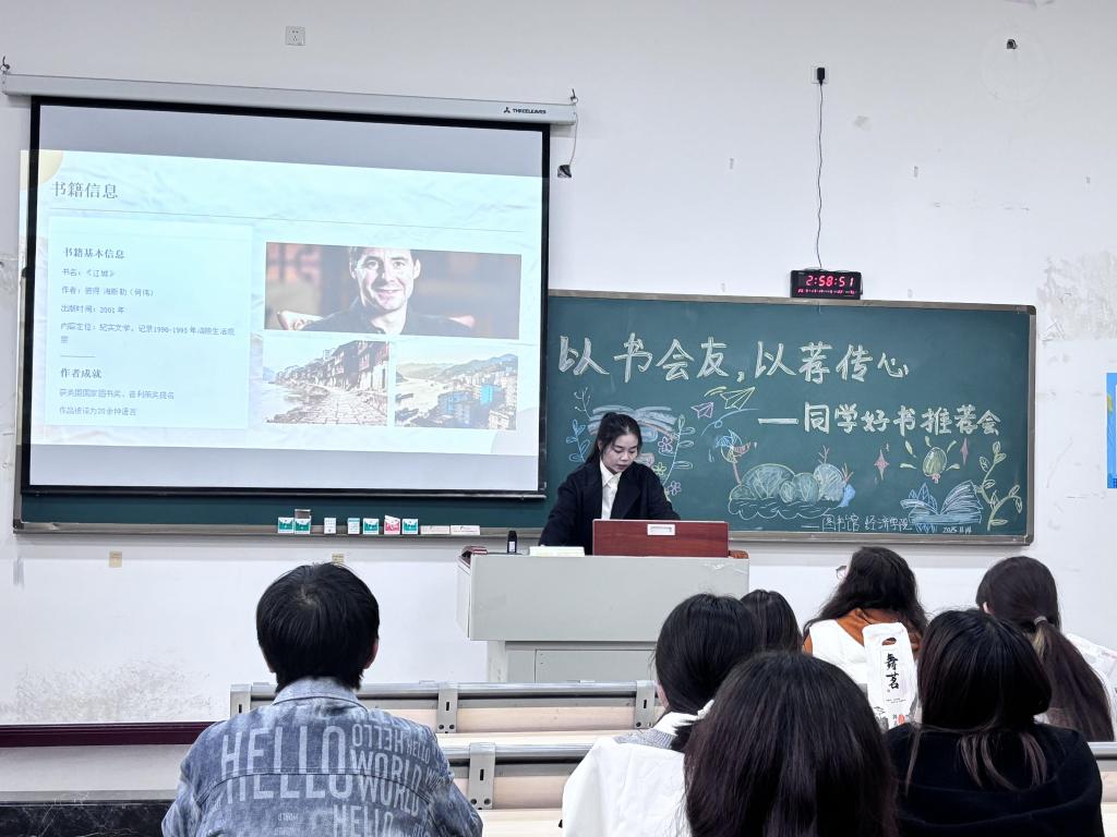 好书推荐会再添人文视角!24级数字经济专业颜灵丽带来文学纪实经典《江城》,该书以外国作家彼得·海斯勒的独特视角,细腻记录上世纪九十年代中国小城涪陵的日常肌理与时代变迁,从市井烟火到社会脉动,生动呈现转型期的中国风貌,为经济学专业同学提供跳出理论框架的观察维度,助力在人文纪实中理解区域发展的社会根基与时代背景,让推荐会的多元分享更具深度与温度。