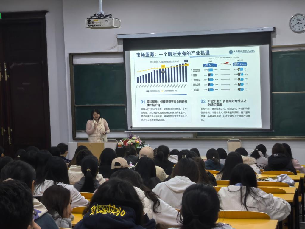多维解码专业图景,助力新生逐梦健康中国。重庆医科大学附属巴南医院护理部总护士长李娟女士率先带来主旨演讲,深度解码 “大健康” 时代核心理念,她强调,我国健康管理已实现从疾病治疗为中心,向预防保健、全方位服务、全生命周期守护的关键转型,标志着健康保障体系迈入更全面、前瞻的发展阶段。同时,她从专业解析、学习条件、院校开设、就业前景、考研方向、职业发展建议六大维度,为新生筑牢专业认知与职业发展根基,提出职业发展 “三步走” 建议:在校夯实基础、考证书、做实习;毕业初期积累一线经验;长期向健康企业运营管理等方向进阶。