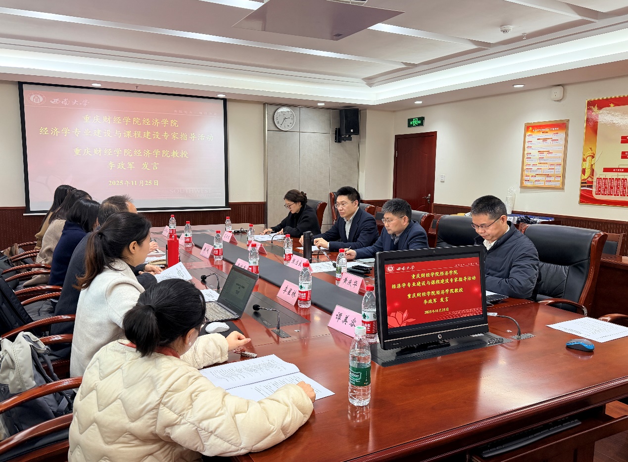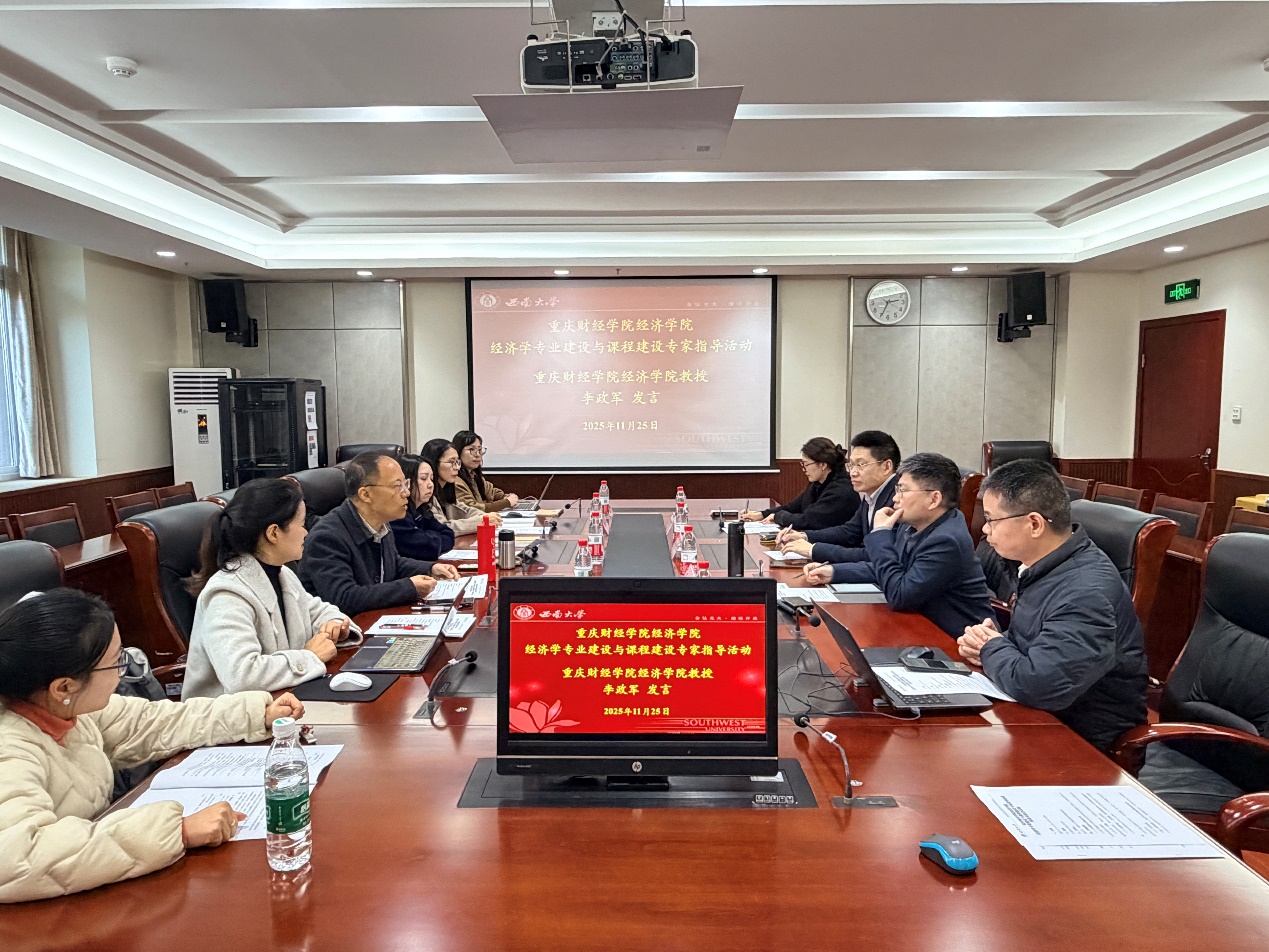 为深化应用型经济学人才培养体系改革,推动专业基础课程创新,11月25日下午,我校经济学教学团队首席教授李政军带领学院骨干教师赴西南大学学习交流,在西南大学经济管理学院A203会议室成功举办了“经济学专业建设与课程建设专家指导活动”。本次活动特邀西南大学商贸学院院长张应良、经济管理学院副院长黄庆华、王小华等专家莅临指导,西南大学经济管理学院副院长黄庆华主持活动,两校专家及骨干教师围绕人才培养、课程优化及未来合作等议题展开深度交流,共谋发展新篇章。