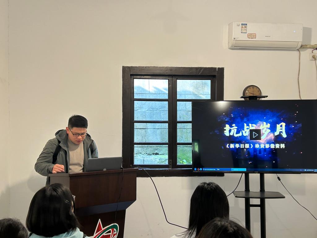 在旧址学习室,活动进入理论学习环节。教师党员代表张浩围绕“从《中国共产党第二十届中央委员会第四次全体会议公报》看新时代文化使命”主题,结合新华日报“传播真理、服务人民”的办报宗旨,领学了公报中关于“激发全民族文化创新创造活力”的重要论述。他倡议师生党员立足新媒体艺术专业优势,推动红色文化与数字艺术深度融合,以青年视角与创新语言讲好党的故事。