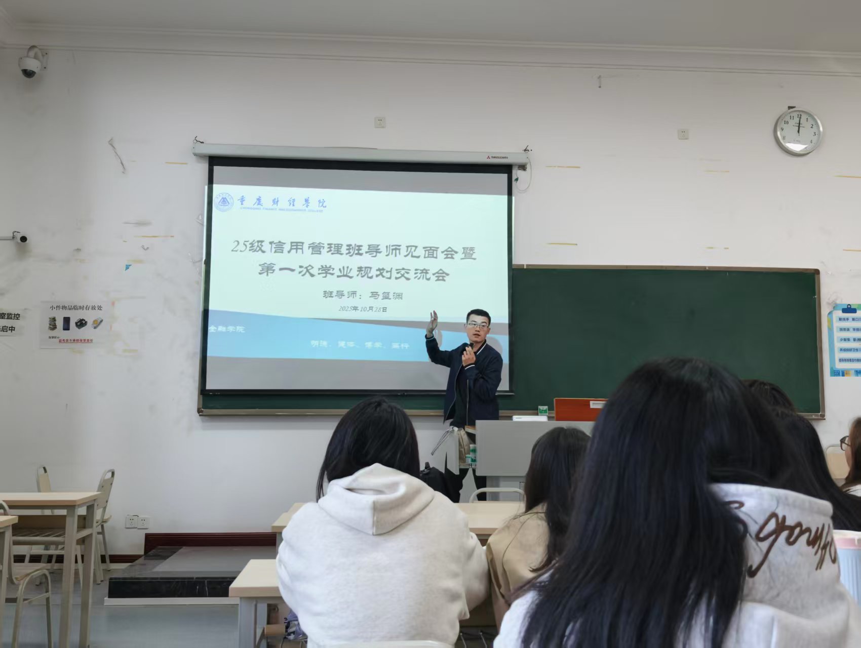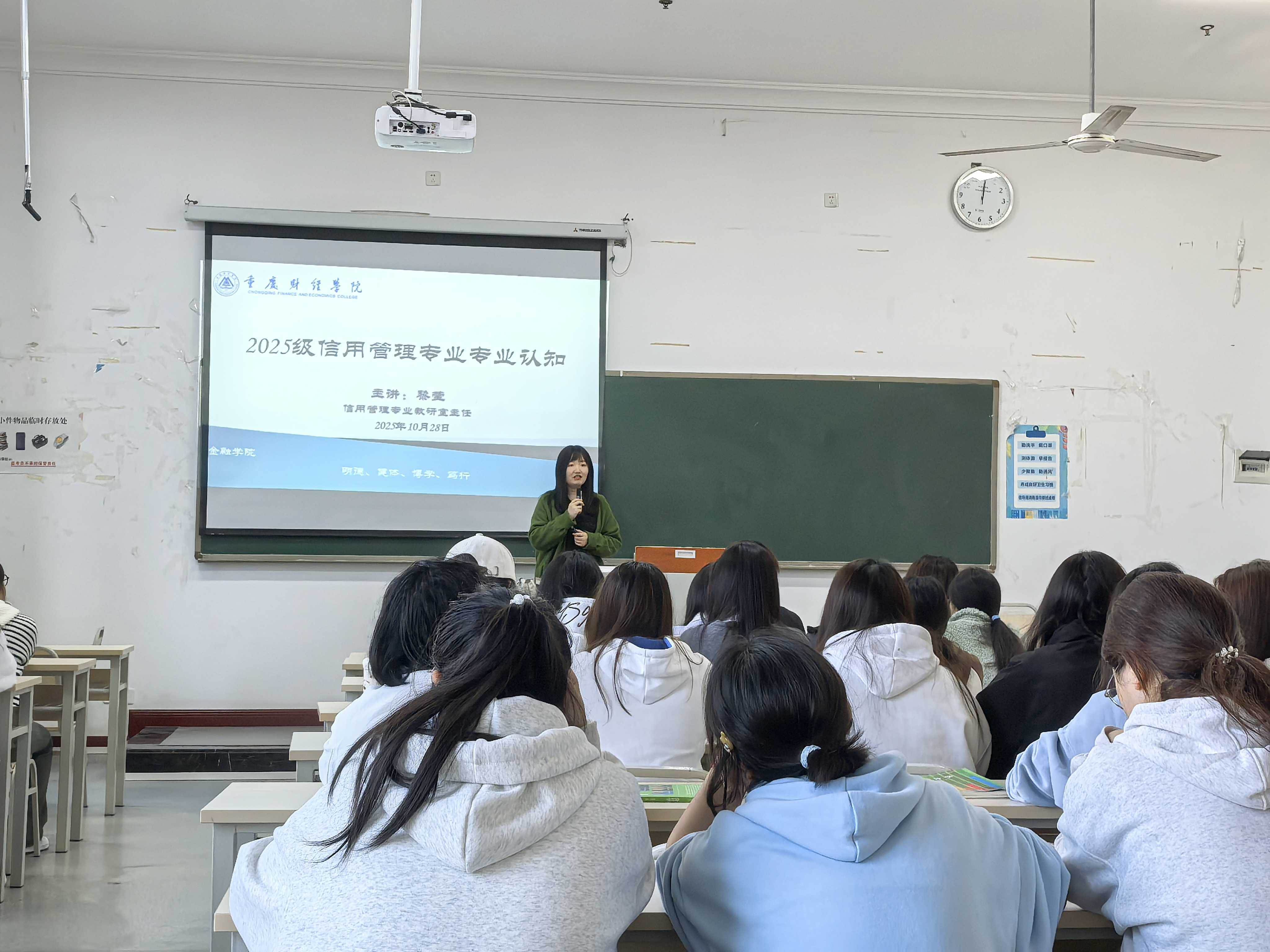10月28日,首场专业认知讲座在学校教学楼如期举行。黎莹主任从专业起源、核心课程体系、行业发展前景三个维度展开讲解。在谈及专业精神内核时,特别阐明“诚信为本、服务民生”的核心价值追求,与学校“育人为本、德育为先”的育人导向高度契合。班导师马玺渊则结合自身从业经验,围绕“大一新生如何开启专业认知与职业规划”提出具体建议。他强调,专业学习既要“读万卷书”,扎实掌握经济学、金融学、信用管理学等基础理论;更要“行万里路”,主动参与实践活动,学习金融发展历史背后蕴含的责任担当。