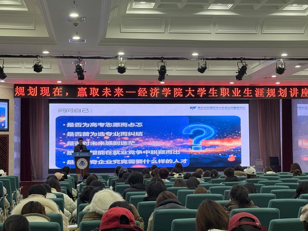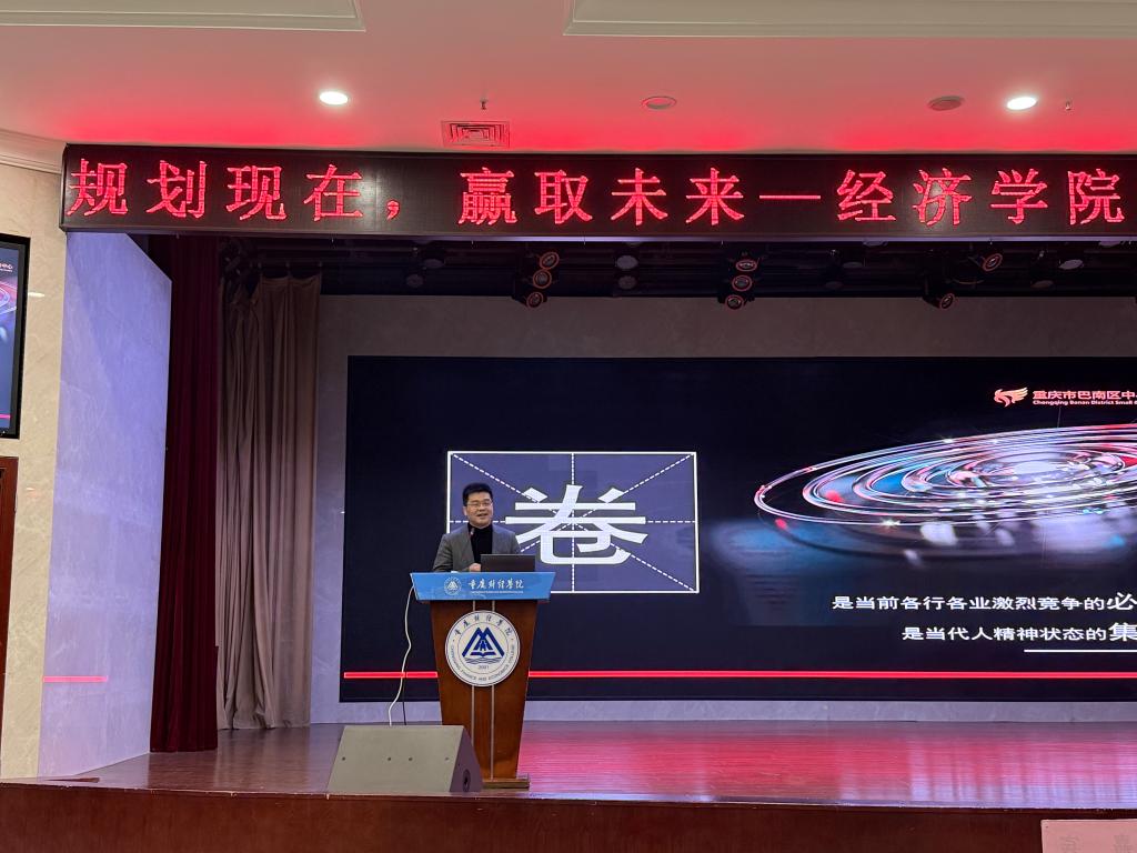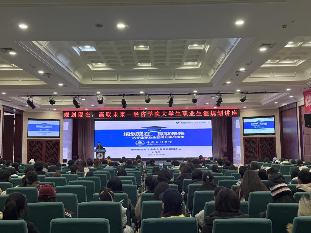 为助力2025级新生在学业起点锚定发展方向,提升自我发展能力,实现“个个有赛道,人人能出彩”的培养目标,2025年11月26日中午,经济学院在学术报告厅开展“规划现在,赢取未来——大学生职业生涯规划”专题讲座。本次讲座由经济学院院长宋湘琴主持,特邀顾迪集团联合创始人、重庆市巴南区中小企业公共服务中心主任、重庆士继嘉知识产权研究院执行院长甘国平担任主讲,学院2025级全体新生参加。