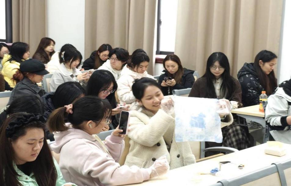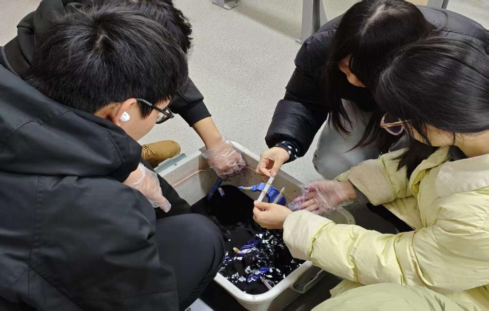 “这个过程真的太解压了,看着色彩慢慢晕开,烦心事好像也跟着消散了。”参与活动的同学笑着分享。在扎染的过程中,同学们专注于手中的作品,将内心的情绪通过色彩与图案来表达,当布料缓缓展开,呈现在眼前的不仅是精美的纹样,更是一次心灵的治愈与释放。