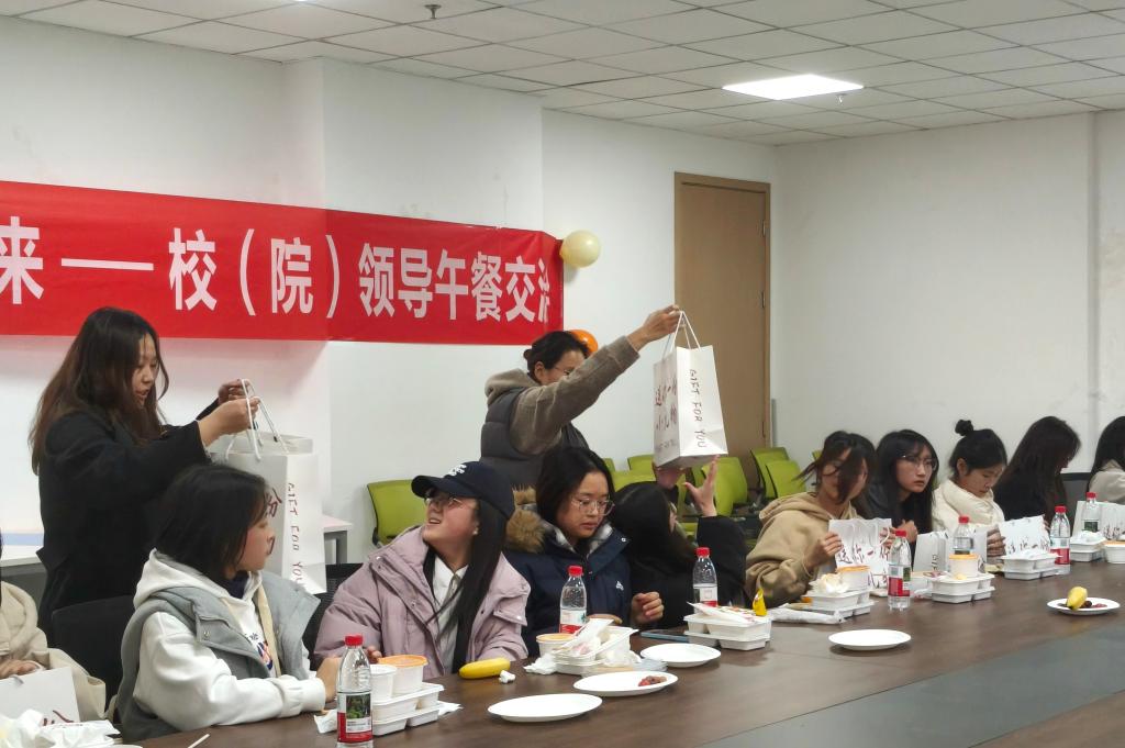 围绕 “学风建设如何落到日常”,学生代表分享心得。李阳同学以《资助与机遇》为题,谈到奖学金缓解了家庭经济压力,让自己能全身心投入学习与科研,未来将以更高标准回馈学校社会;谭程同学以《感恩与担当》为主题,分享了在资助政策与老师帮助下克服困难的经历,作为班干部,他主动参与班级建设、学风督促和朋辈帮扶,力求让“勤学互助” 成为班级共识。午餐交流环节,师生围坐畅谈,气氛轻松热烈。同学们围绕专业学习方法、考试压力调适、考研英语复习、就业规划、竞赛与学业平衡及课程优化建议等踊跃发问。老师们结合经验细致解答,梳理学习规划路径,记录合理建议,并就“资助资源运用”“学习内驱力培养”“示范作用发挥”等给出针对性指导,让同学们收获颇丰。活动中,学院为同学们发放 “温暖大礼包”,传递关怀与鼓励。