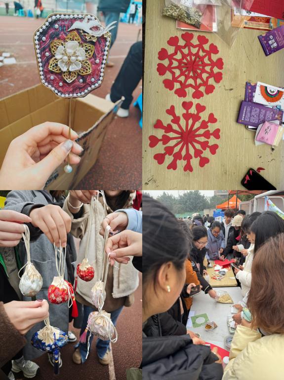 12月9日上午,学院举办非遗文化手工实践活动,以剪纸、香包制作和小团扇制作为活动内容,吸引百余学生踊跃参与。学院组织DIY手工社团成员,将三项传统手工活动同步开展。剪纸区,社团成员演示折、剪、刻技巧,学生们手持红纸,剪出花鸟、福字等纹样;香包区,大家选取各色香包,填入艾草、茉莉花干和紫草叶等香料;小团扇区,学生们用珍珠、铃铛、流苏在素面扇上进行装饰。学生们热情高涨,专注投入创作,不时相互交流技巧。经过不断练习,一件件剪纸作品、香包、手绘团扇相继完成,学生们手持成果拍照留念,笑容满面。