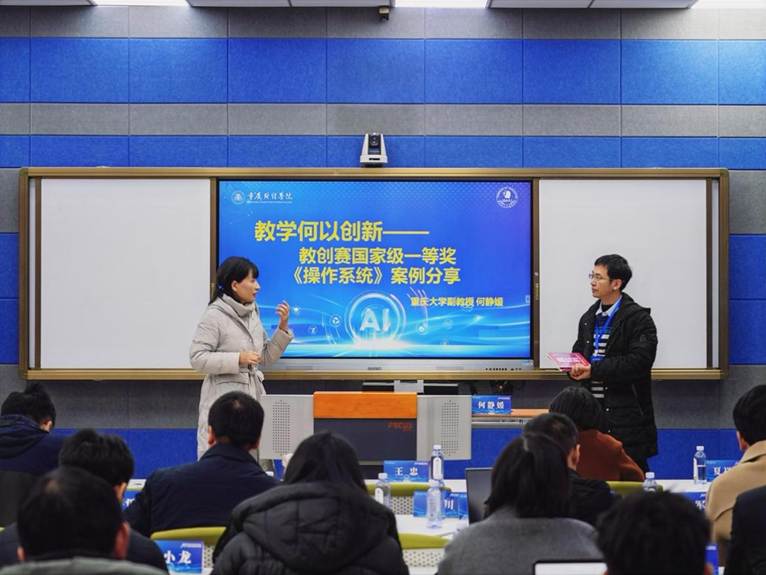 随后,重庆大学教授何静媛以“教学何以创新——教创赛国家级一等奖《操作系统》案例分享”为题,生动解析了国家级教学创新大赛的优秀实践。她强调,智慧课程建设不仅需要技术融合,更应注重教学设计创新与学生能力培养的协同推进。