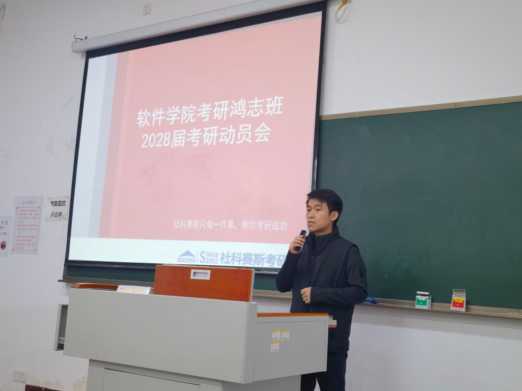 为帮助2024级学生前瞻性规划学业,树立考研目标,12月30日,软件学院于教学楼1401教室成功举办“算法筑梦,研途同行”2028届考研动员会。专业指导蒋老师应邀主讲,年级组长梁容老师及2024级100余名同学齐聚一堂,共话研途。