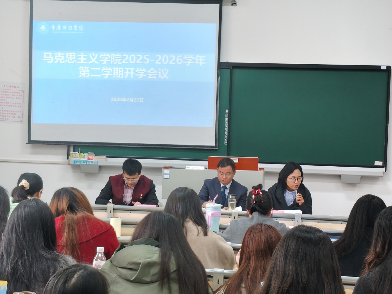 为深入贯彻学校2025-2026学年第二学期第一次全体中层干部大会精神,全面落实本科教学工作合格评估决战决胜要求,统筹部署新学期各项工作,引导全体教职工聚力攻坚,2月27日上午10:30在教学楼1307教室,马克思主义学院召开了2025-2026学年第二学期第一次全体教职工会议。学校党委书记张毅莅临指导,学院院长常晓薇、党总支副书记崔文卿出席会议,全体教职工参加会议。会议由院长常晓薇主持。