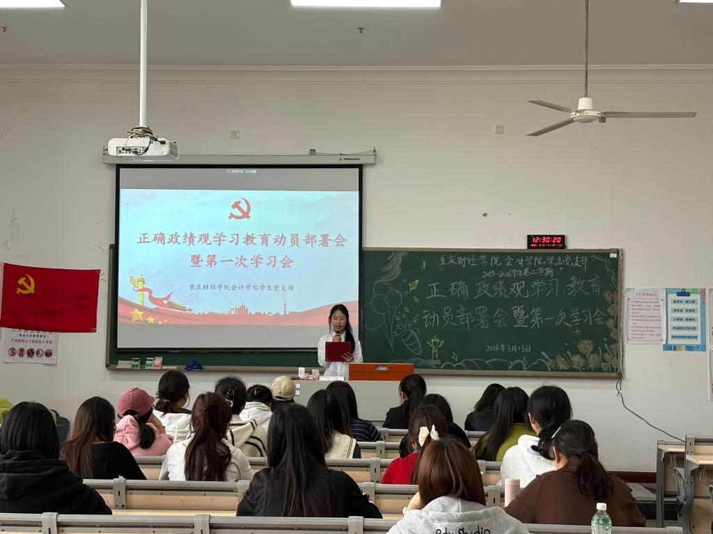 为深入学习贯彻习近平总书记关于树立和践行正确政绩观的重要论述,引导青年党员筑牢思想根基、树立科学务实的政绩理念,为实现“十五五”良好开局凝聚青春力量,3月13日中午,会计学院学生党支部于教学楼1601教室召开树立和践行正确政绩观学习教育动员部署会暨第一次学习会。会计学院党总支书记宋钰静、学团办副主任陈晨、学生第一党支部书记黄洁、第二党支部书记谢雨贝、第三党支部书记黄娟出席会议,全体学生党员参加会议,会议由刘鑫怡同志主持。