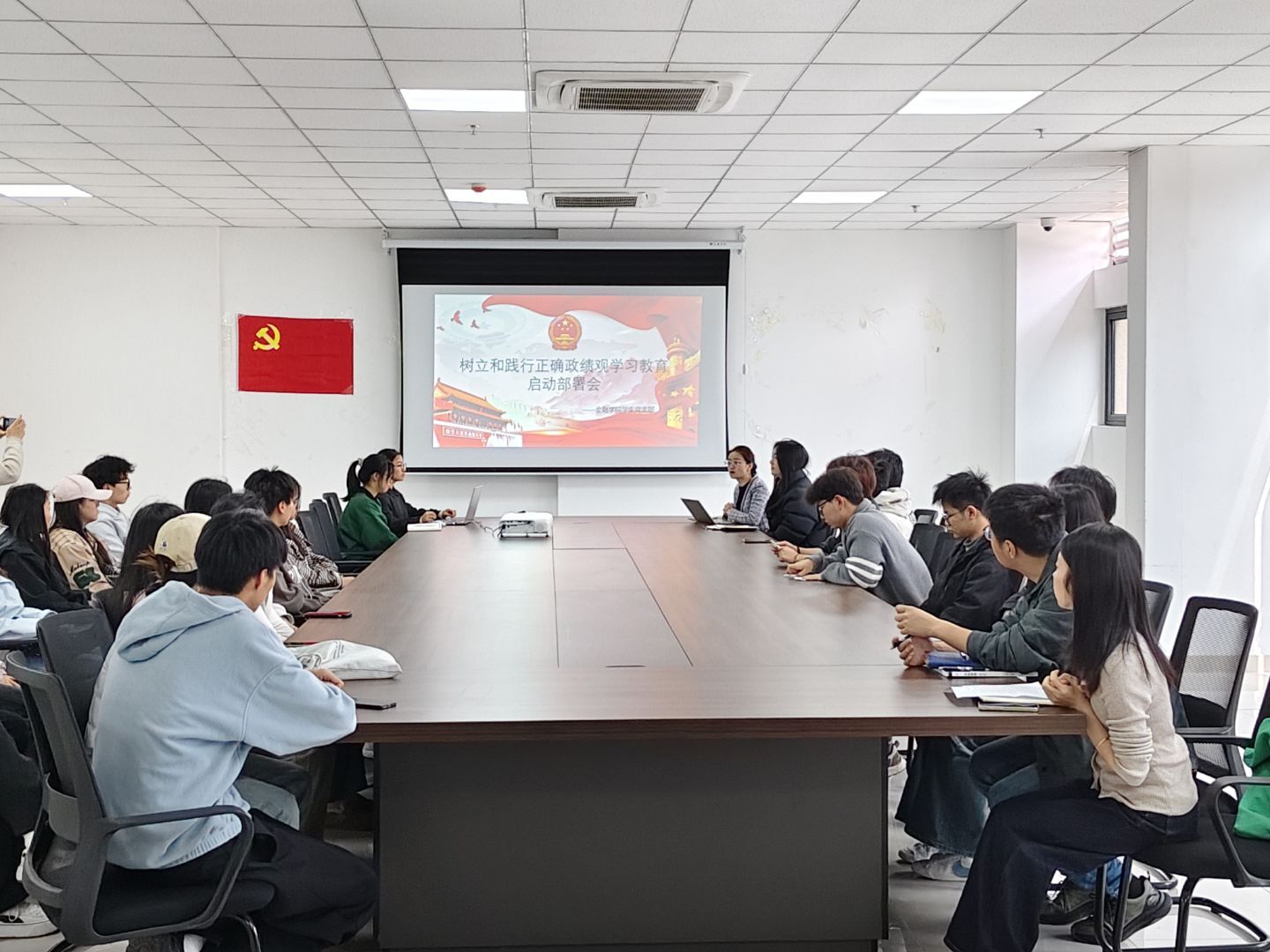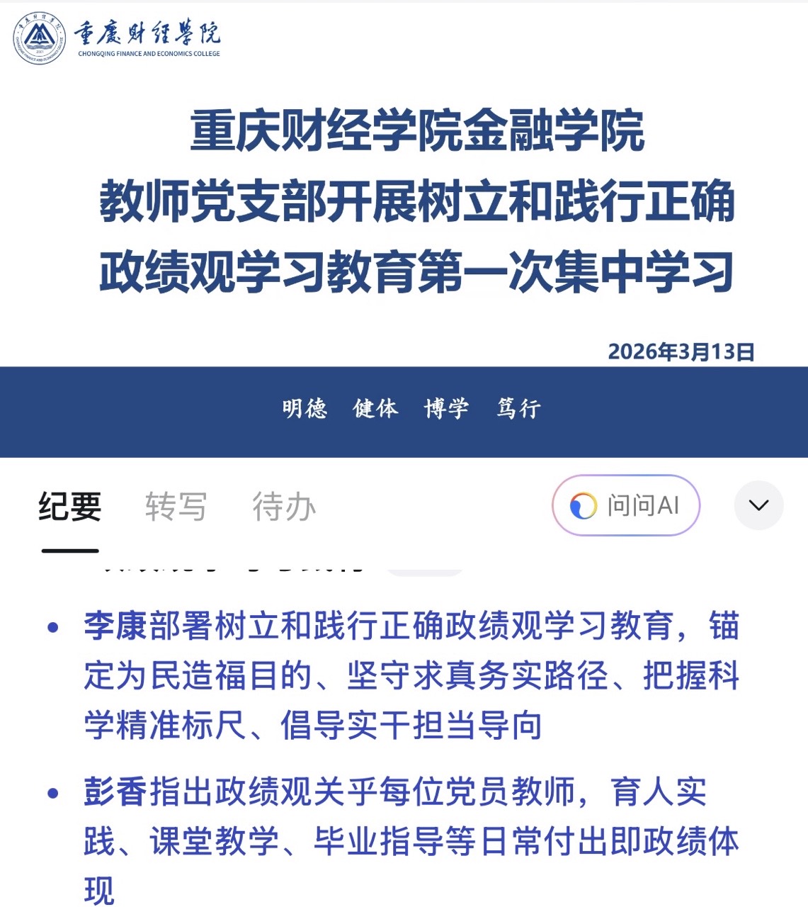 为深入学习贯彻习近平总书记关于树立和践行正确政绩观的重要论述,引导全院党员、干部筑牢思想根基、强化使命担当,金融学院党总支于2026年3月13日召开树立和践行正确政绩观学习教育启动会暨第一次集中学习。本次学习采取“总支统一部署、支部分头实施”的方式,结合师生不同特点,学生党支部在线下开展集中研讨,教师党支部同步进行线上专题学习。金融学院党总支书记张玉华、教师支部书记李康、学生支部书记马秋婵,及全体师生党员参加学习。
