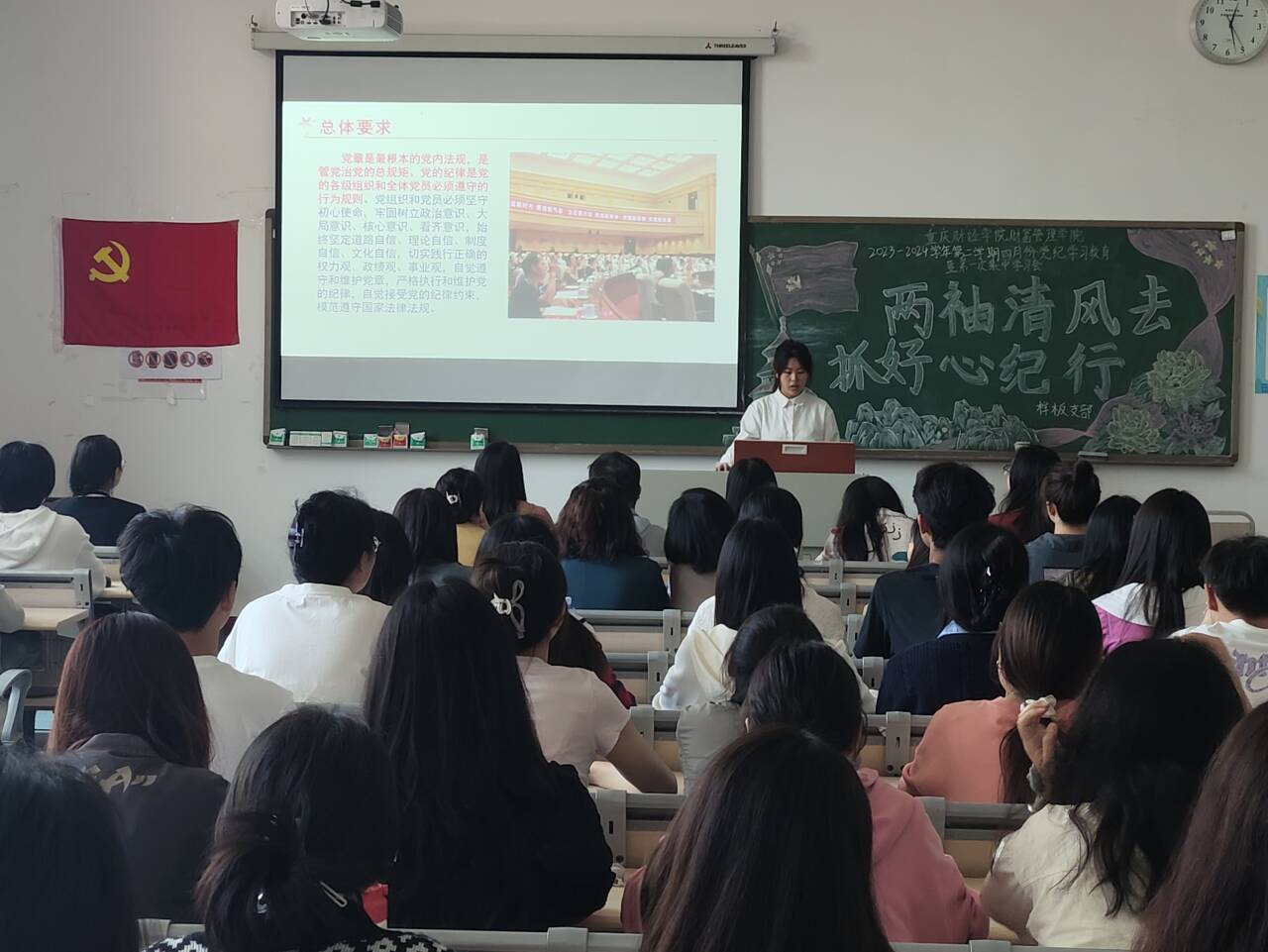 习近平总书记指出,要全面加强党的纪律建设,党规制定、党纪教育、执纪监督全过程都要贯彻严的要求。为进一步贯彻落实习近平总书记关于党纪教育和纪律建设工作的指示批示,推进党纪学习教育常态化长效化,进一步加强我院党的纪律建设。4月26日中午,我校财富管理学院教师党支部联合学生党支部在教学楼1623教室开展了以“两袖清风去,抓好心纪行”为主题的党纪学习教育启动会暨第一次集中学习会。全体教师党员、学生党员、预备党员以及党员服务站全体工作人员参加本次会议。
